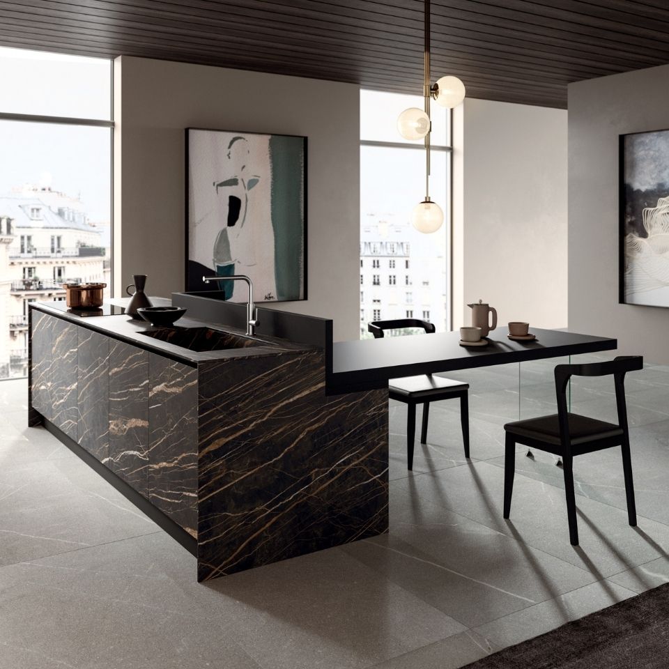 The strength of this modern Italian kitchen lies in its dynamic with shades that evolve depending on the projected angle of light. Stainless steel surfaces give the kitchen a contemporary touch. The grey stoneware, Pietra di Savoia is complimented by the gloss white glass and by the white open elements extending its look to the bright free-standing library in matt white Erika pet. Sophisticated colour tones in a room to create a beautiful and fascinating place to stay. It’s the moment where the home shows its elegance, in a warm and convivial atmosphere.