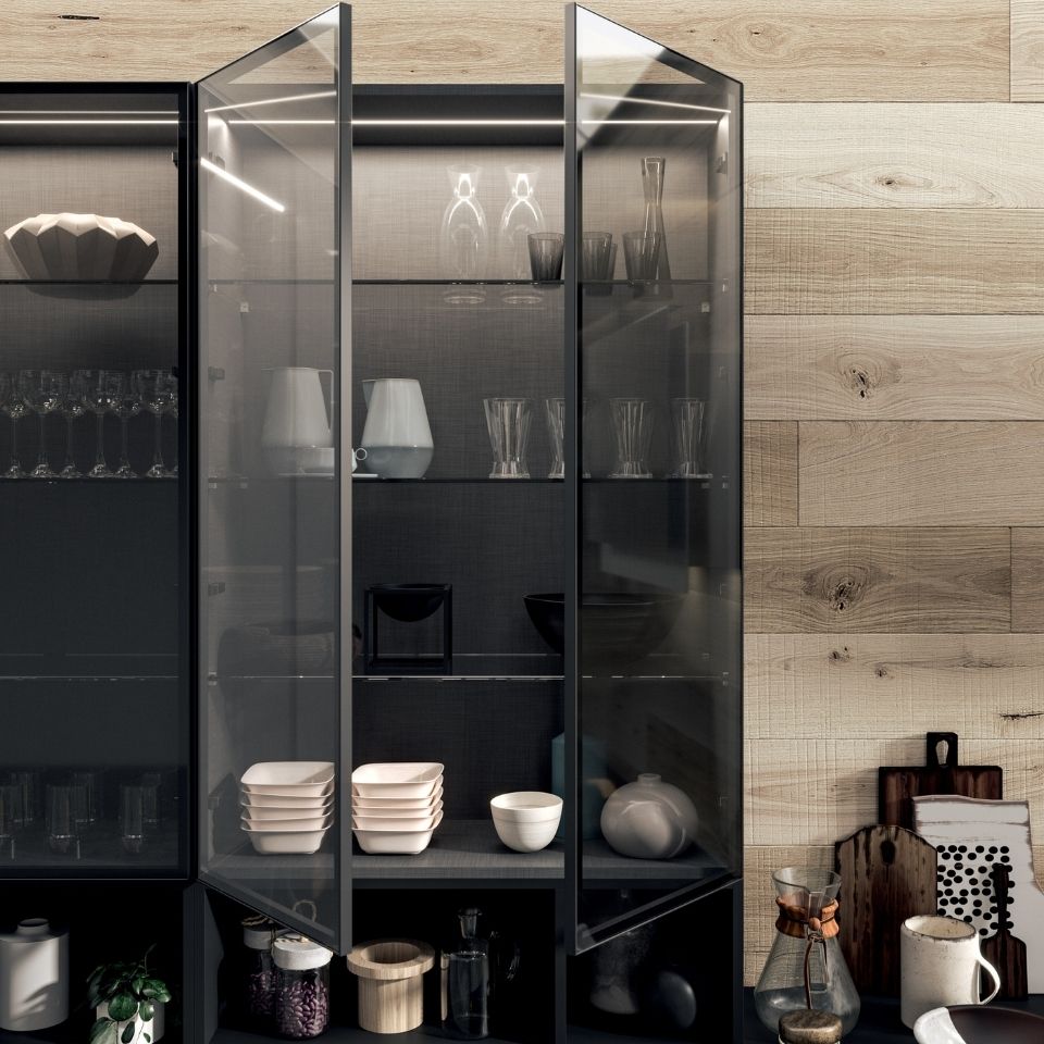 Now is the time to make fresh and innovative choices. Bold, warm and attractive the Italian kitchen line, Bijou, expresses itself through elegant tones of matt glass such as pure white, dove blue, bold colours such as sulphur-yellow or charming hues such as silk grey that fulfil the desires of light when it brightly sparkles on the glass wall cabinets. Shown with aluminium c-channel, plinths, frame and the black worktop with a seductive touch on the open elements.