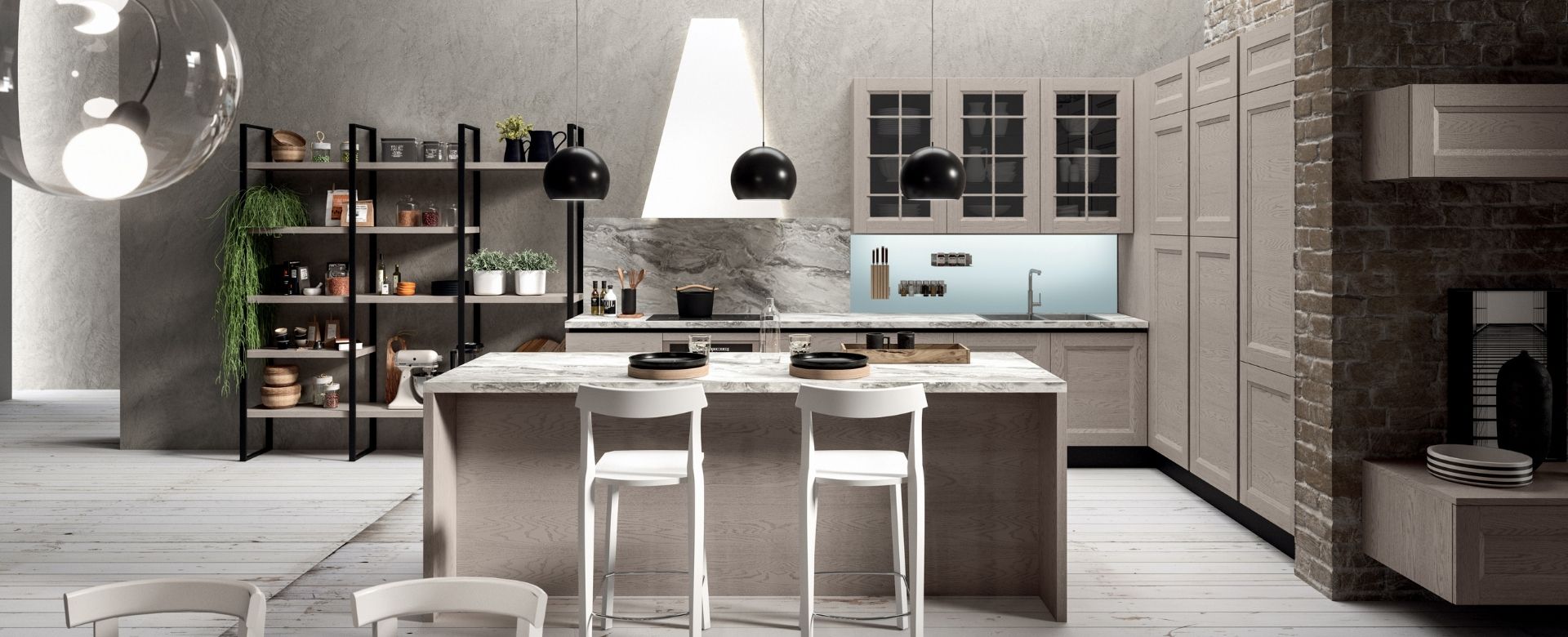 Ylenia is a country-style kitchen model that is fused together with modern elements. The ample storage units with glass features are traditional to country-style kitchens while the edges and handles give it its modern appeal. The Ylenia is made for the unusually shaped room and features four lacquered finishes: white, mink, anthracite and beige. The wood version comes in washed ash, pickled blue avio, dark oak and tobacco walnut.